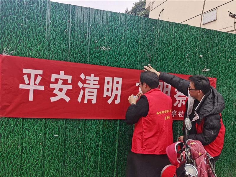 活動中,志愿者與社區(qū)工作人員向居民發(fā)放倡議書,呼吁社區(qū)居民進一步樹立“安全文明、綠色環(huán)!鼻迕骷漓胄嘛L尚,建議用鮮花祭祀、絲帶寄哀思、網(wǎng)絡(luò)祭掃等文明簡約、綠色環(huán)保的祭掃方式來寄托哀思,營造文明有序的祭祀環(huán)境。