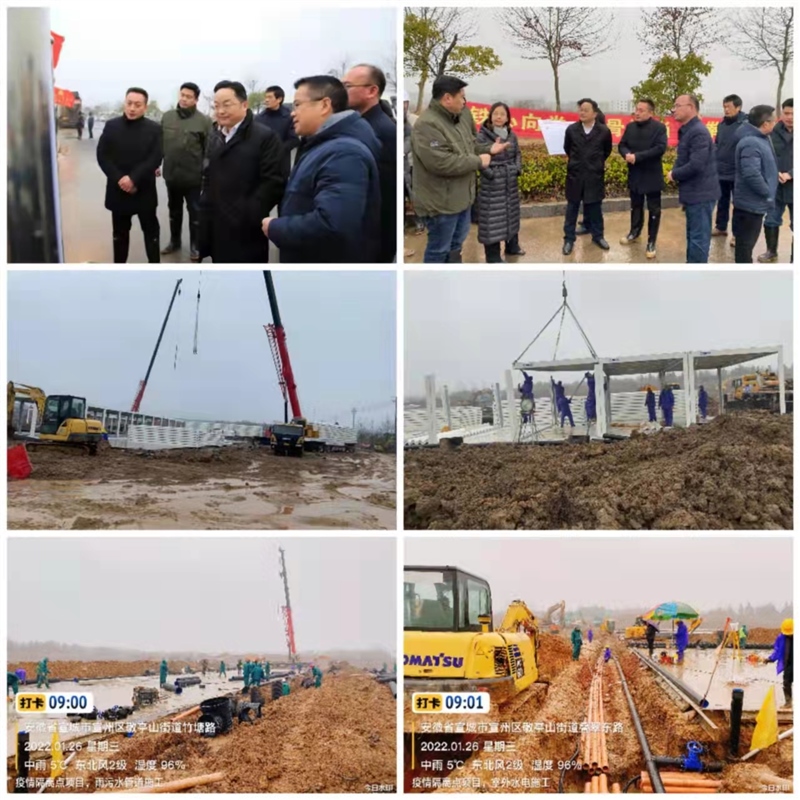 截止1月26日,現(xiàn)場已完成10000平方米混凝土硬化,雨污水管道、室外水電管道安裝進展迅速,集裝箱板房開始拼裝。天氣惡劣、工期緊迫,一線人員努力克服各種困難和障礙,迎難而上。1月25日下午,區(qū)政府召開宣州區(qū)新冠肺炎疫情防控工作專題會議,審定了隔離點項目方案,明確了相關(guān)事項,會議對施工進度和現(xiàn)場管理給予了充分的肯定,同時也要求在嚴把工程質(zhì)量關(guān)和隔離點各項要求的基礎上,倒排工期,加快施工,確保早日交付使用。